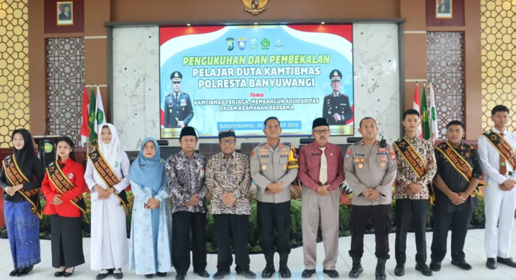Prosiber.com – Sebanyak 280 pelajar dari berbagai sekolah di Kabupaten Banyuwangi resmi dikukuhkan sebagai Duta Keamanan dan Ketertiban Masyarakat (Kamtibmas) tahun 2025. Pengukuhan ini diselenggarakan oleh Polresta Banyuwangi melalui Satuan Pembinaan Masyarakat (Satbinmas) di MAN 2 Genteng pada Kamis (30/10/2025).